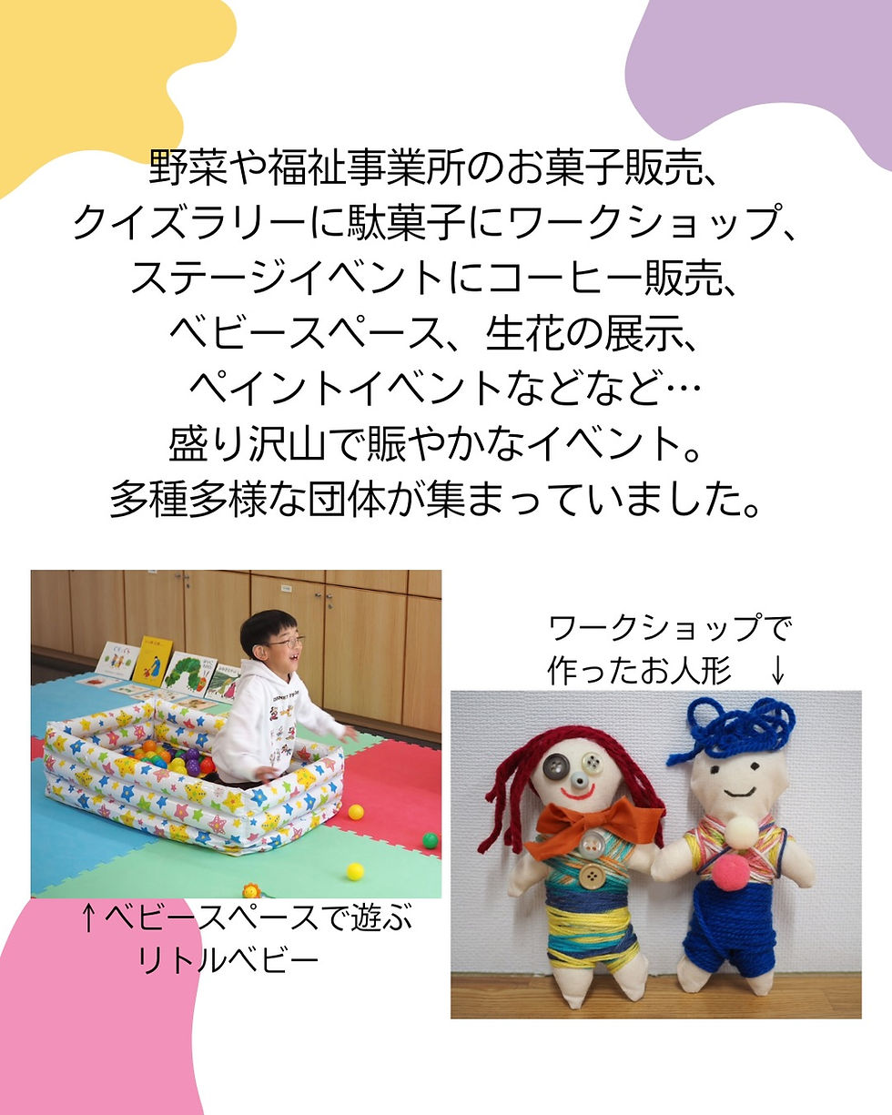 野菜や福祉事業所のお菓子販売、クイズラリーに駄菓子にワークショップ、ステージイベントにコーヒー販売、ベビースペース、生花の展示、ペイントイベントなどなど…